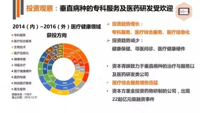 获投比较热门的领域有「专科服务」方向,如肿瘤、牙医、母婴类;有「医疗综合服务」方向,如健康管理平台;有「生物技术」方向,如药物研发、生物制药;有「医疗信息化」方向,如数据管理、SaaS 服务;有「健康保健」方向,如康复医疗、老年保健等。