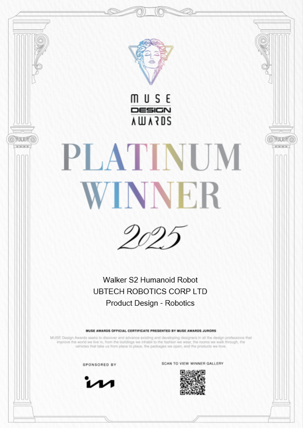 此次问鼎MUSE设计铂金奖,Walker S2以实力证明中国在人形机器人领域的设计创新实力与产业化应用潜力。从创意设计到产品实现,从中国智造代表到全球应用标杆,来自中国的前沿科技成果正在重塑智能智造的价值。优必选作为中国新质生产力的AI代表,不仅引领着行业发展方向,更为全球智能制造升级开启了全新篇章。