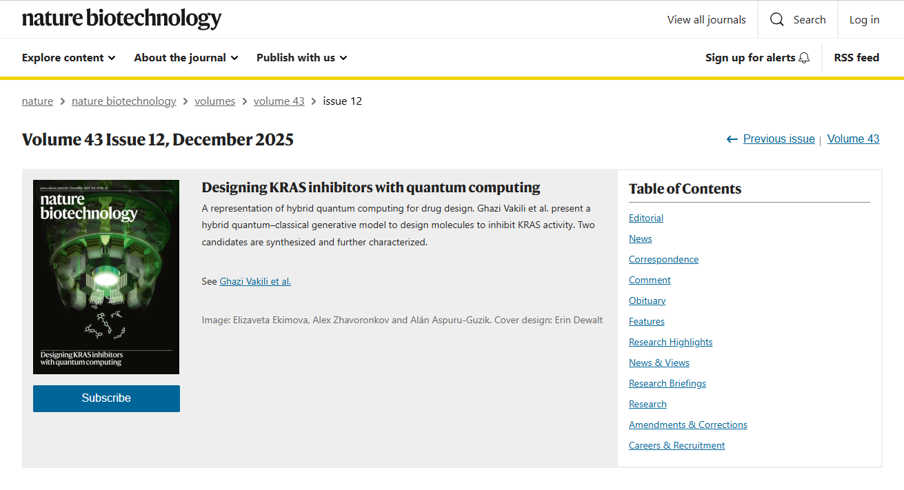 由启明创投投资企业英矽智能参与的研究《Quantum-computing-enhanced algorithm unveils potential KRAS inhibitors》入选本次年度十大研究进展榜单,并荣登封面。这也是量子计算在药物发现领域的成果首次入选Nature Biotechnology年度重点关注文章名单。