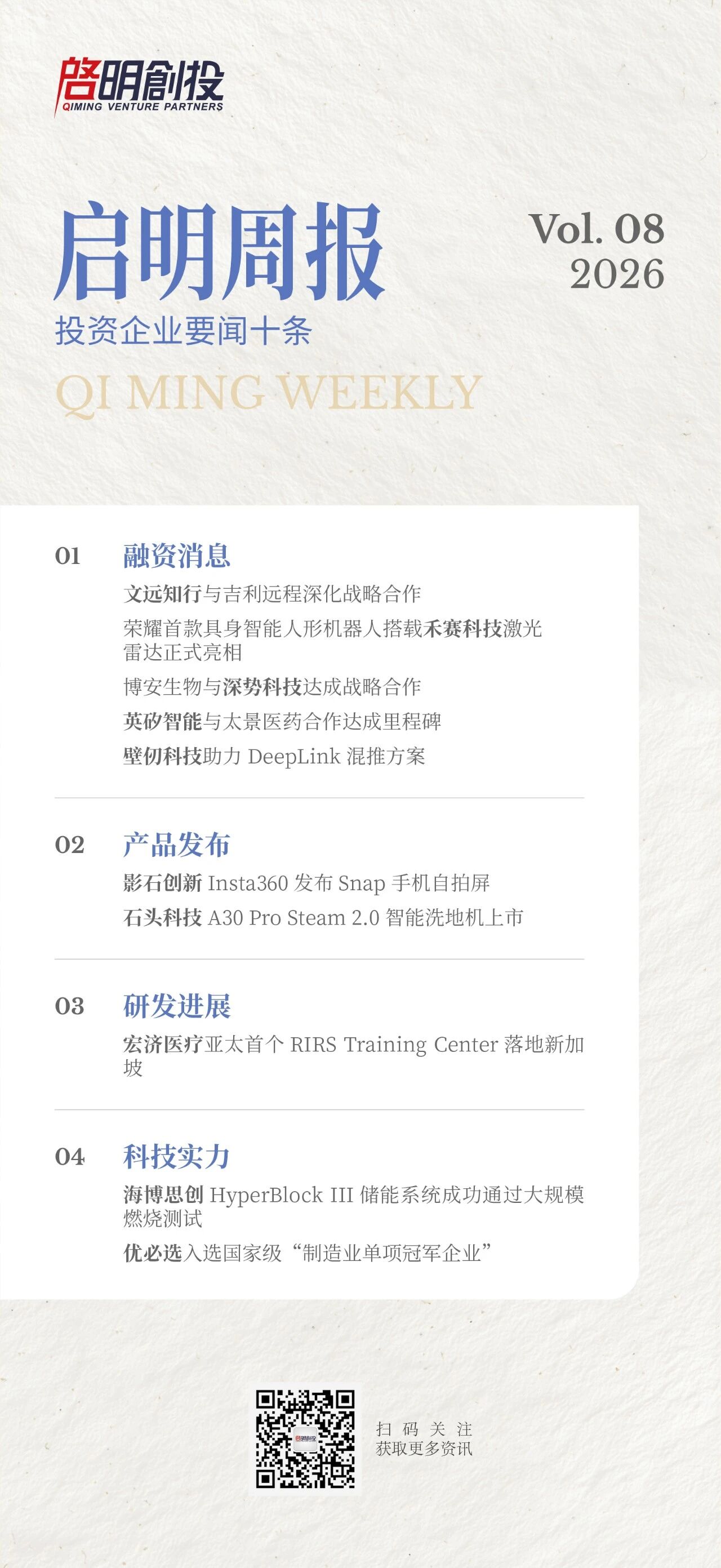 编者按:2026年,《启明周报》升级焕新,每周定期更新,仅精选启明创投投资企业的十条重磅动态,涵盖融资进展与发展突破等。
