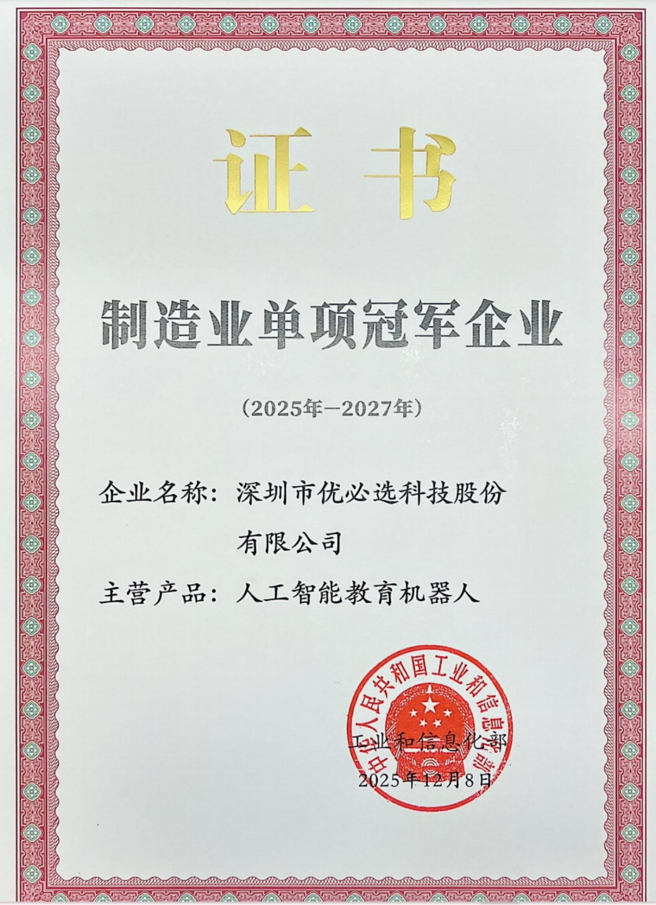 近日,启明创投投资企业优必选科技(09880.HK)凭借“人工智能教育机器人”在全球范围的市场占有率优势、研发及制造领先性,顺利通过工业和信息化部审核,获得“国家级制造业单项冠军企业(2025-2027)”荣誉。这一制造业领域的顶级荣誉,代表了企业在特定细分市场中的全球领先地位,也是对公司在人工智能教育领域研发积累和技术创新能力的认可。