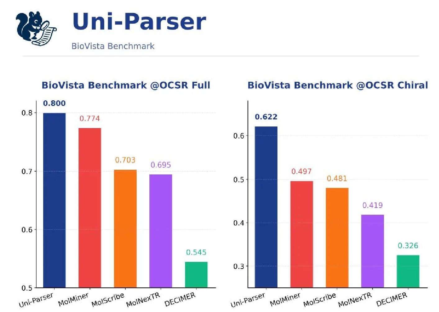 Uni-Parser 已具备真正工业级的大规模生产能力,并首创了层级化树结构的文档解析范式。在性能方面,Uni-Parser在化学结构解析任务上展现出行业领先能力,能够稳定处理行内分子(inline molecules)与表格内分子(table-contained molecules)等复杂结构形态,显著突破传统OCR与多模态大模型在密集化学表达解析中的能力瓶颈。在自建的科学文献与专利解析解析的基准测试(Uni-Parser Benchmark)中,Uni-Parser相较于主流文档解析方法取得了显著领先的整体性能优势,尤其在科学文本、数学公式、分子定位和识别,以及复杂科学版面的阅读顺序上,有明显的优势。Uni-Parser还提供标准化API服务能力,无需本地环境配置或复杂依赖部署,即可通过接口一键调用完整解析能力。